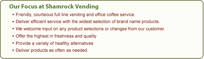 At Shamrock Vending, we offer dependable and reliable vending service for you and your employees. Our vending equipment is brand new and state of the art which includes the highest quality Snack Vending Machines, Coffee Vending Machines, Food Vending Machines, Coca Cola Vending Machines, Pepsi Vending machines, Juice and Water Vending Machines all tailored to the needs of your break room.